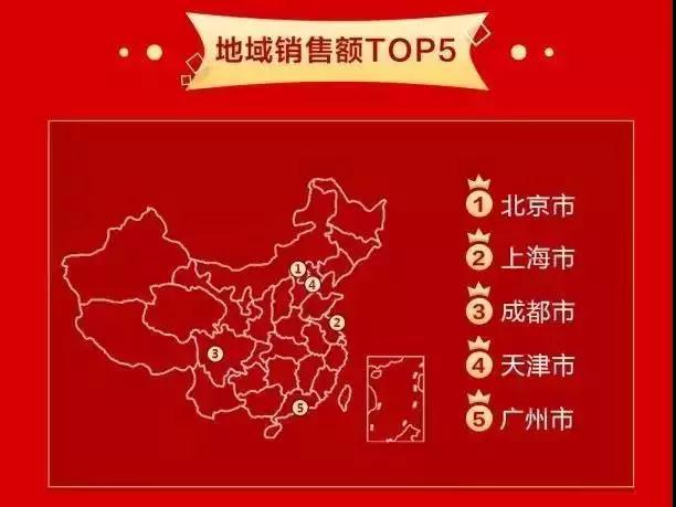 从地域销售额排行来看,北京、上海、成都、天津、广州占据了榜单前五席。