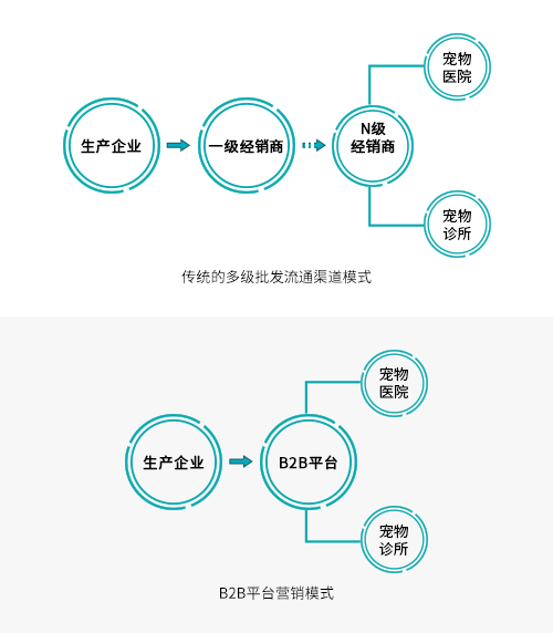 在宠物行业快速发展的赛道上,各企业纷纷入局在各细分领域布局及快速成长。有早先进场已进入成熟期,如波奇网、乐宠网等。相比各个公司于ToC赛道的快速布局发展,萌宠界则瞅准国内宠物医药细分领域B端,定位于中国宠物行业第三方B2B营销平台,以互联网技术为基础,链接上游供应链(生产企业、商业公司)和下游小B端(宠物医院、宠物诊所),覆盖行业资讯、商品交易、物流配送、金融等,形成宠物医药行业全产业链服务。