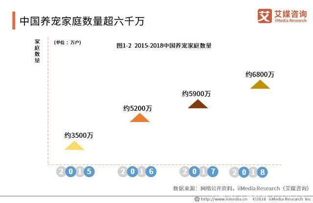 同时,中国养宠家庭数量逐年上升,2018年近7千万。分析师认为,中国养宠家庭数量的上涨很大一部分原因是家庭养宠观念进步,宠物身份地位日益被家庭重视。