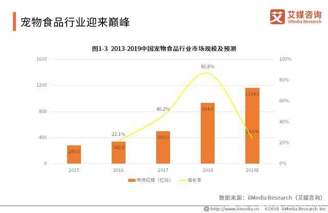 宠物食品行业也随之迎来快速发展。数据显示,宠物食品行业在2018年市场规模达到934亿,增长率达86.8%,增长幅度较往年大幅提升。