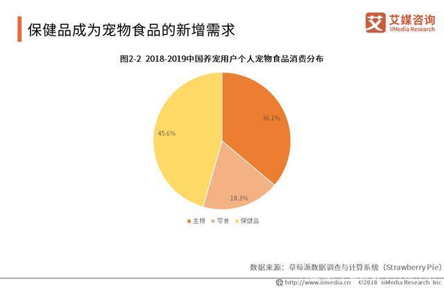 值得一提的是,保健品成为宠物食品的新增需求。数据显示,宠物保健品支出在养宠用户支出中占比最大为45.6,其次为主粮(36.1%)、零食(18.3%)。