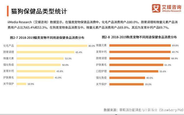在猫类宠物保健品消费中,化毛产品消费用户占80.0%,肠胃调理和微量元素产品消费用户占比为65.4%和53.3%。在狗类宠物食品消费当中,微量元素产品消费用户占69.8%,其后为发育补钙产品69.7%。