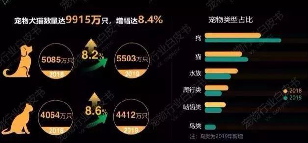 养宠数量方面,2019年全国城镇宠物犬猫数量达到9915万只,比2018年增长766万只。其中宠物犬数量为5503万只,比2018年增长8.2%;宠物猫数量为4412万只,比2018年增长8.6%,宠物猫数量增幅超过宠物犬的增幅。