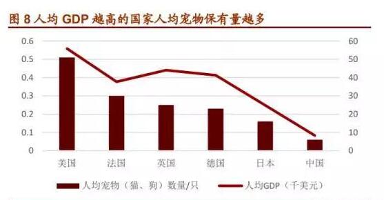 根据对标市场(欧美)的一些研究,宠物行业会在人均GDP达到8000美元的时候,会进入一个快速增长期。中国现在正在开始发展,从饲养的家庭占比来看,差不多能够在2%左右,而北京、上海差不多在8%-10%。