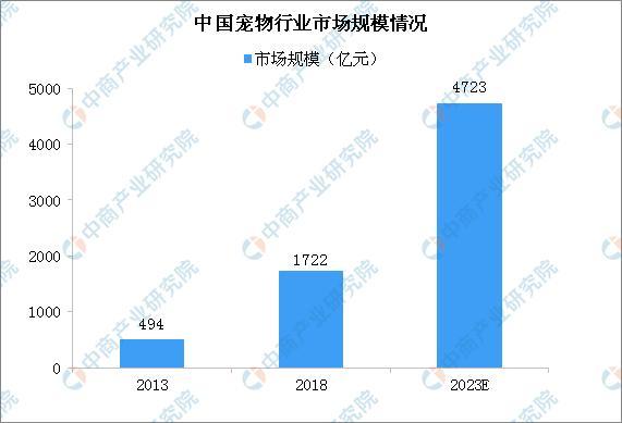 中国宠物行业经过二十多年的发展已逐渐形成规模。据统计,2013年中国宠物行业市场规模不足500亿元,2018年市场规模增至1722亿元,是2013年宠物市场规模的3倍多,预计2023年宠物市场规模将达到4723亿元。随着宠物地位愈发重要,宠物年均消费的增多,未来宠物市场规模将进一步扩大。