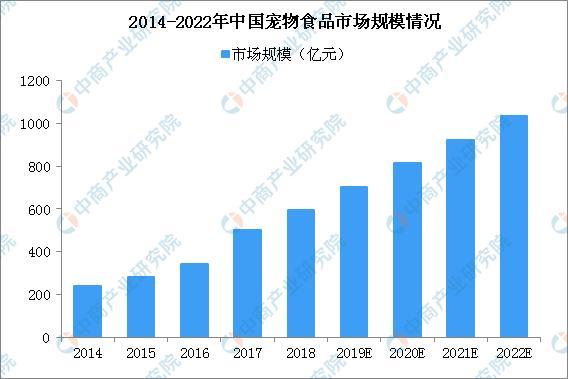 我国宠物食品行业市场规模持续扩大,2014年中国宠物食品规模240亿元,2018年增至594亿元,预计2022年宠物食品市场规模将突破千亿。
