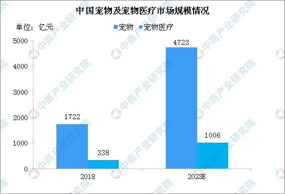 随着宠物的地位愈发重要,越来越多消费者心甘情愿为宠物买单,2018年宠物行业市场规模达到1722亿元,中国宠物医疗市场规模约为338亿元,占比近20%。预计2023年宠物市场规模将达到4723亿元,宠物医疗市场规模突破千亿。