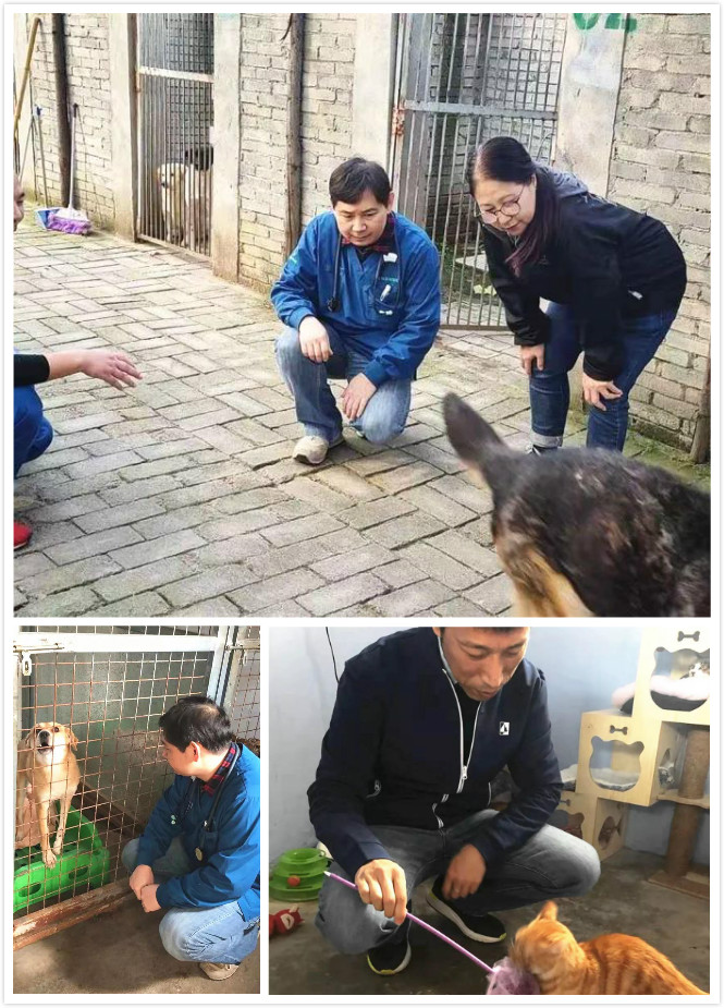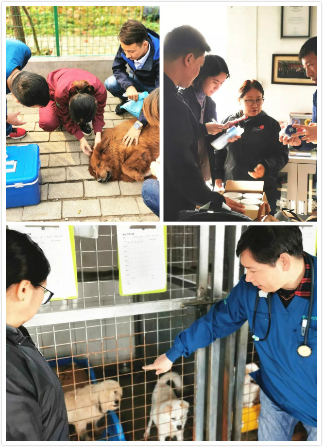 由小动物诊疗专家张拥军老师带队的医疗支援团队,耐心仔细的给基地的毛孩子们检查身体。
