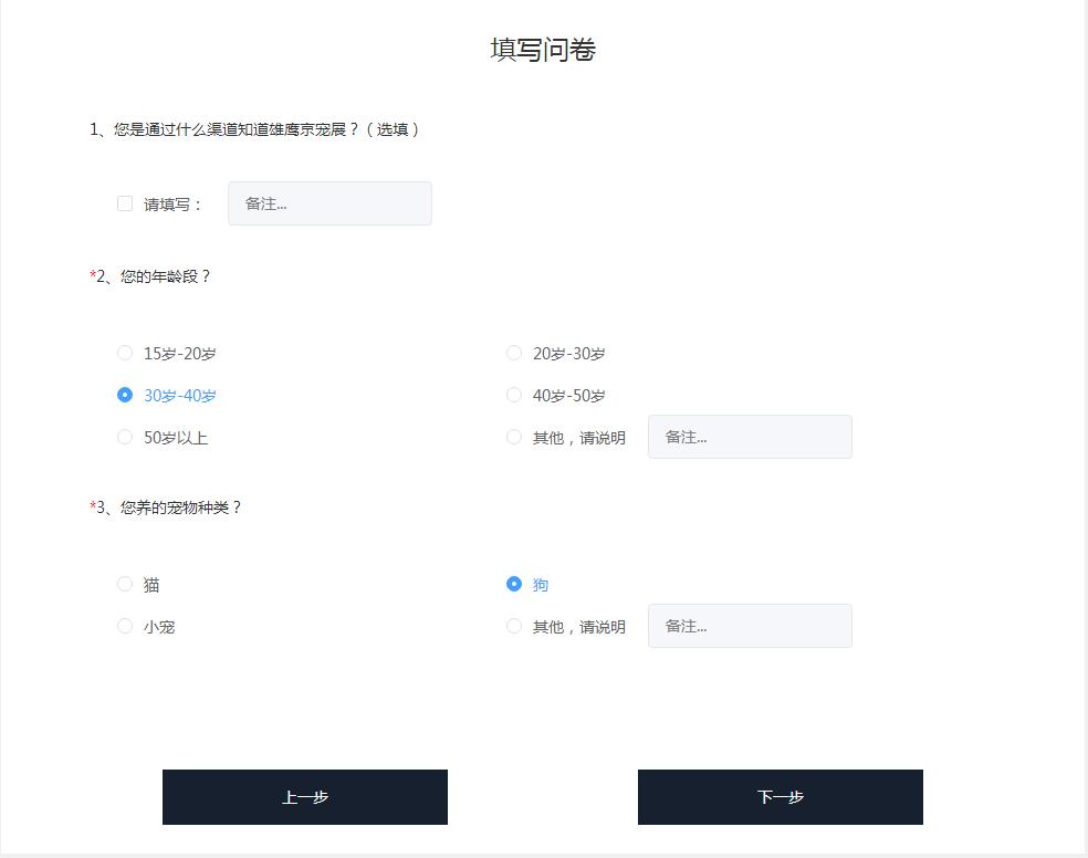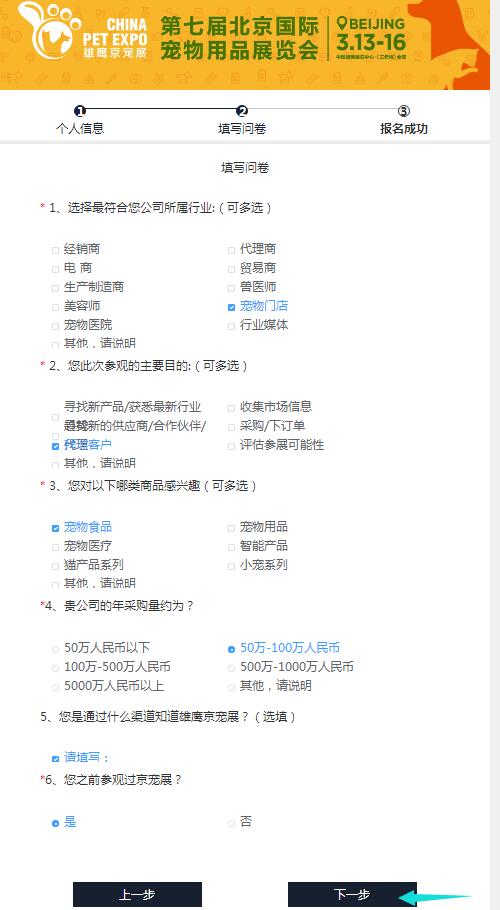 填写:勾选 所属行业、参观目的、感兴趣商品、采购量、是否参加过京宠展,及填写:通过什么渠道知道京宠展的?→下一步