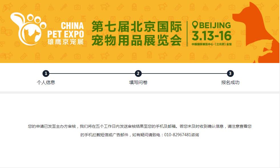预登记成功→需要通过主办方审核通过,通过后将结果发送到您手机及邮箱进行确认,若有疑问请拨打:010-82967481咨询;