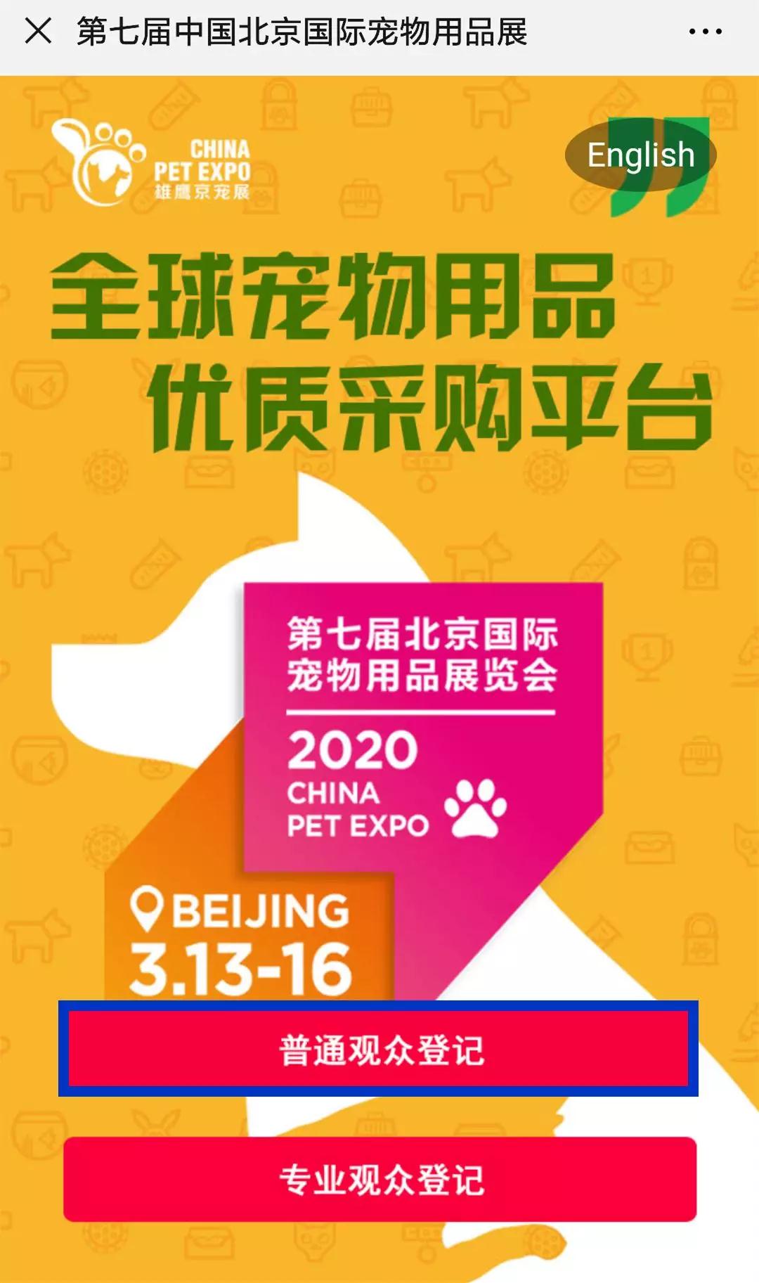 首先您可以通过扫描二维码或通过“雄鹰京宠展”微信公众号【参观登记】进入预登记页面