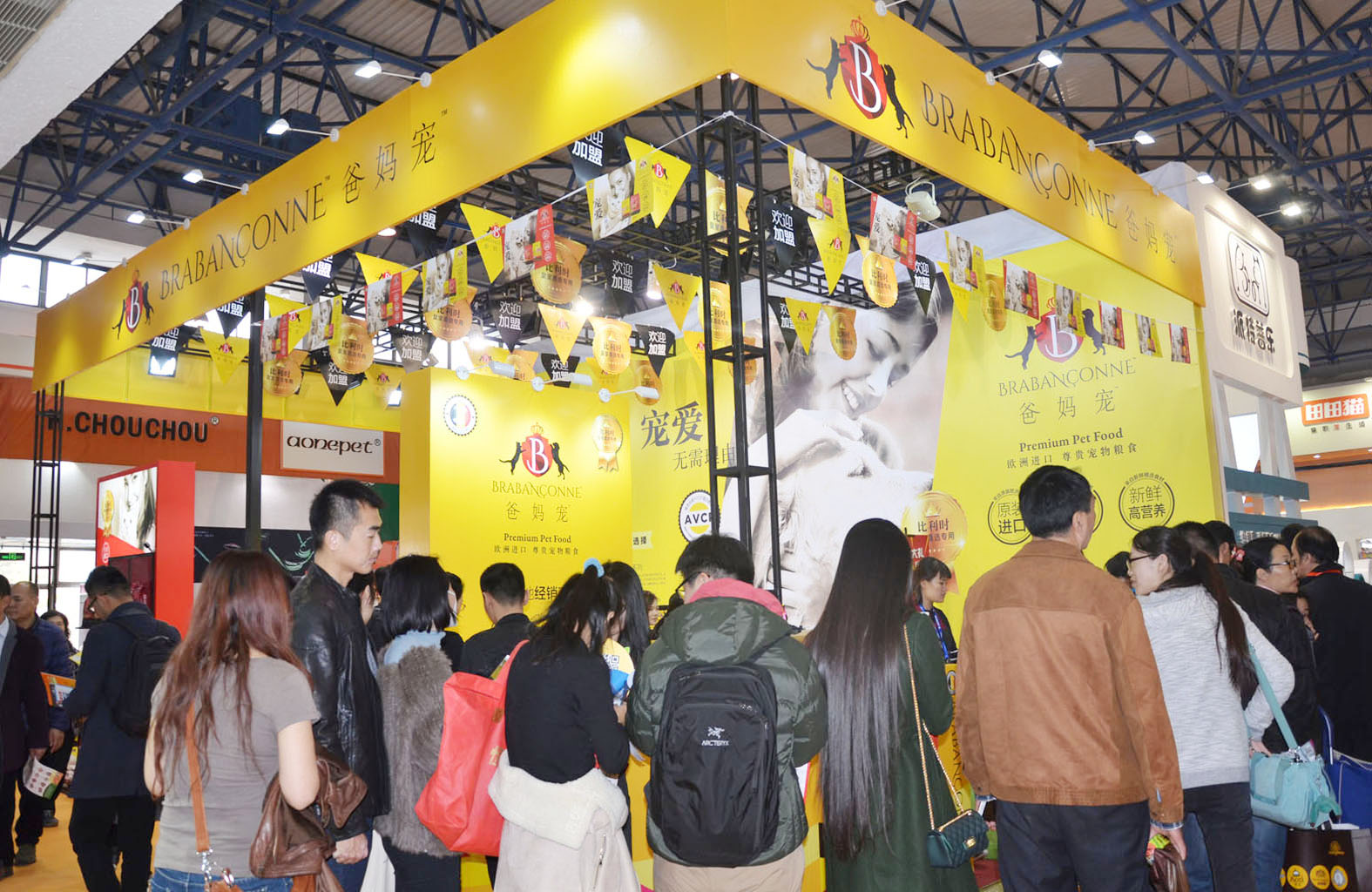 爸妈宠Brabanconne展位的呈现风格延续其颜色分明、具有国际化元素的产品包装风格,在黄色的主背景中,配合红、黄颜色的金属宠粮展示台,给展会人员与众不同的视觉体验,吸引了众多消费者的眼球。