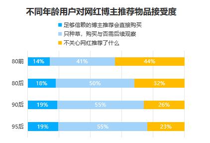 相比其他年龄用户,95后对于网红博主推荐的物品有更高的接受度。77%的95后都会考虑购买网红博主推荐的物品,现实中常常感到孤独的他们,在网络世界中不吝于把信任交给一个陌生人,如果商品确实好,那就又有了一个可以信任的人,如果商品有瑕疵也不过是损失一点钱财。