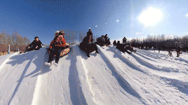 和狗子一起坐上雪圈,开始启动!雪圈逐渐加速,越转越快,耳边风呼啸而过,深切感受这个冬天,几圈下来让您和狗子倍儿爽,好不尽兴,重新排队,继续旋转!