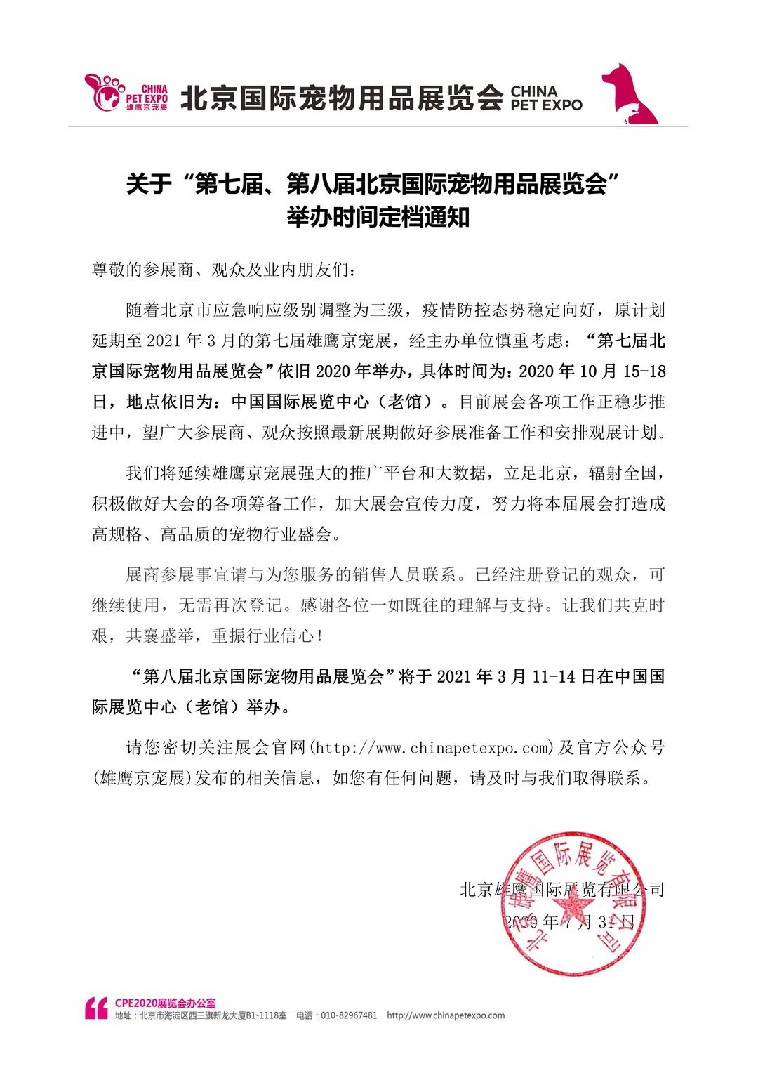 随着北京市应急响应级别调整为三级,疫情防控态势稳定向好,原计划延期至2021年3月的第七届雄鹰京宠展,经主办单位慎重考虑:“第七届北京国际宠物用品展览会”依旧2020年举办,具体时间为:2020年10月15-18日,地点依旧为:中国国际展览中心(老馆)。目前展会各项工作正稳步推进中,望广大参展商、观众按照最新展期做好参展准备工作和安排观展计划。