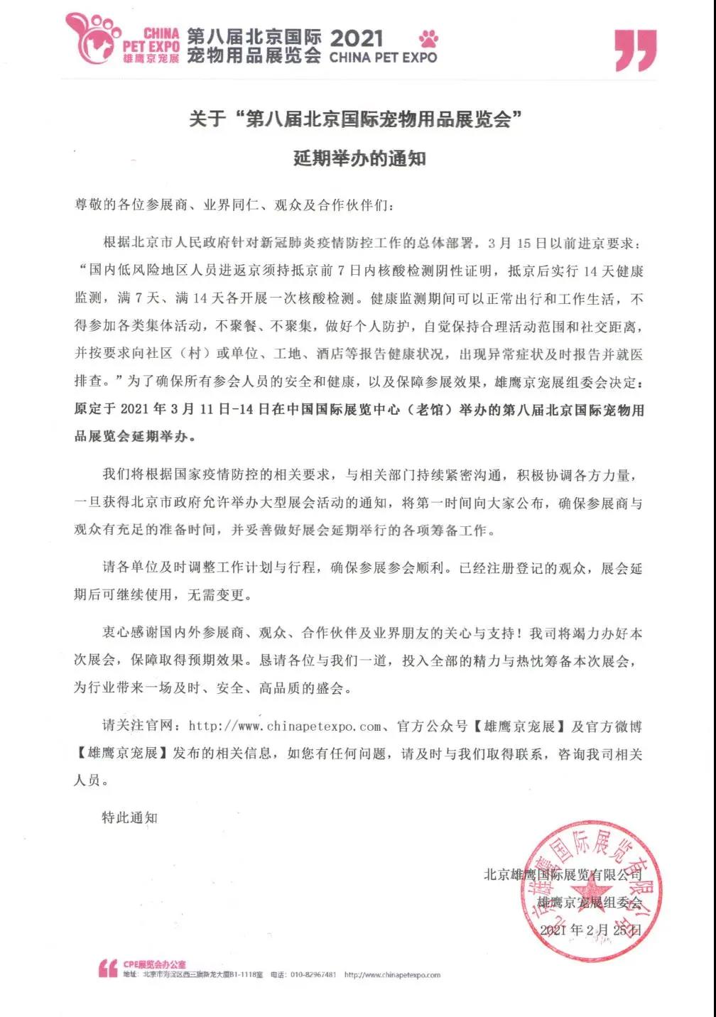 根据北京市人民政府针对新冠肺炎疫情防控工作的总体部署,3月15日以前进京要求:“国内低风险地区人员进返京须持抵京前7日内核酸检测阴性证明,抵京后实行14天健康监测,满7天、满14天各开展一次核酸检测。健康监测期间可以正常出行和工作生活,不得参加各类集体活动,不聚餐、不聚集,做好个人防护,自觉保持合理活动范围和社交距离,并按要求向社区(村)或单位、工地、酒店等报告健康状况,出现异常症状及时报告并就医排查。”为了确保所有参会人员的安全和健康,以及保障参展效果,雄鹰京宠展组委会决定:原定于2021年3月11日-14日在中国国际展览中心(老馆)举办的第八届北京国际宠物用品展览会延期举办。