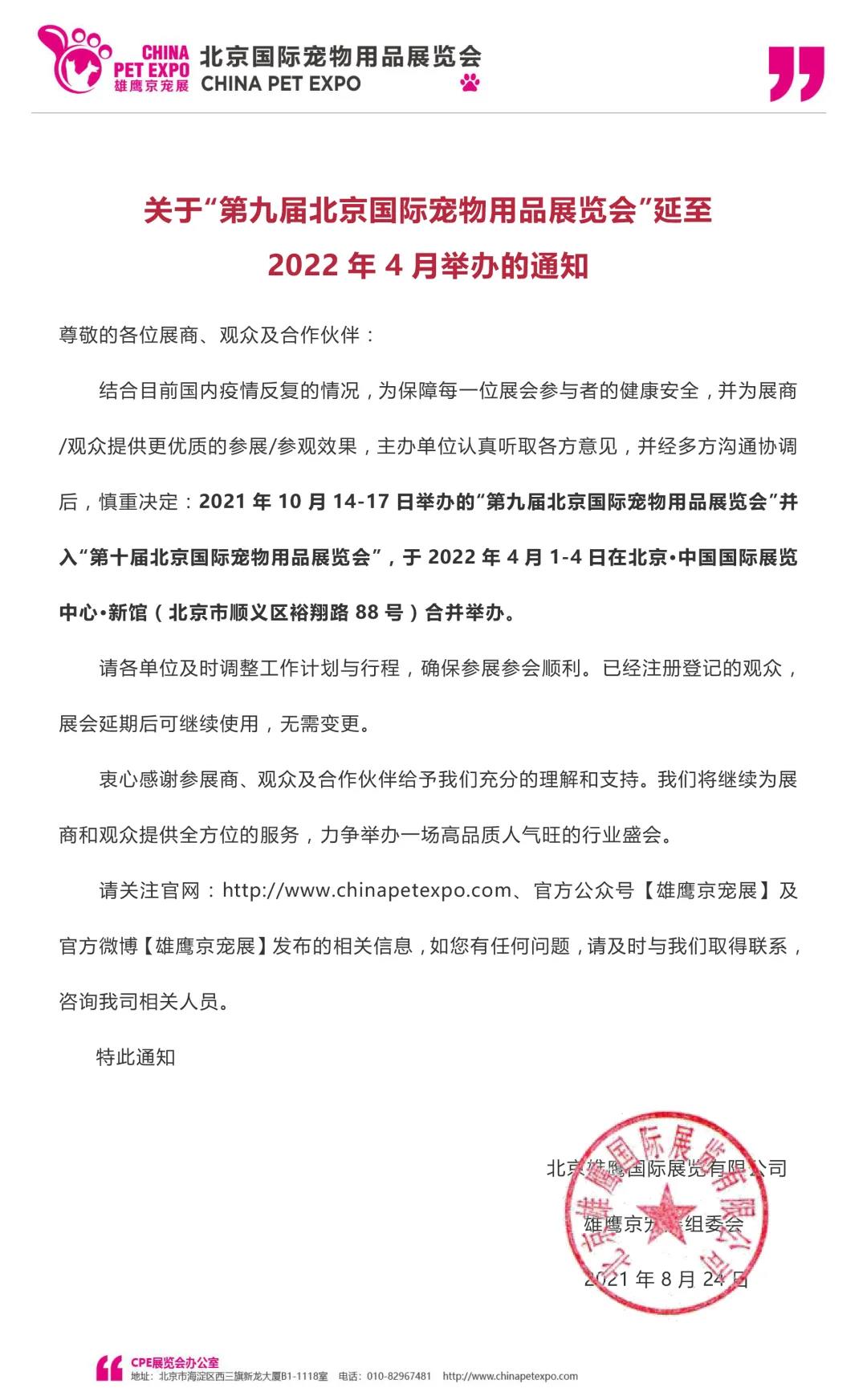 结合目前国内疫情反复的情况,为保障每一位展会参与者的健康安全,并为展商/观众提供更优质的参展/参观效果,主办单位认真听取各方意见,并经多方沟通协调后,慎重决定:2021年10月14-17日举办的“第九届北京国际宠物用品展览会”并入“第十届北京国际宠物用品展览会”,于2022年4月1-4日在北京·中国国际展览中心·新馆(北京市顺义区裕翔路88号)合并举办。