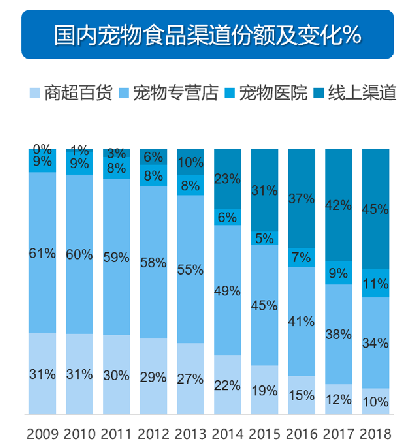 根据Euromonitor数据,2009-2018年宠物食品电商渠道占比由0.3%迅速跃升至45.4%,并于2017年成为宠食销售第一大渠道。