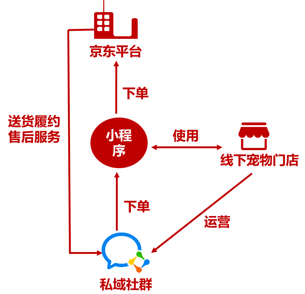 合作的线下宠物门店可以通过京东宠物优选小程序连接京东采购平台,再将京东宠物优选小程序分享到自己的私域社群中,C端消费者在小程序内下单,订单将回传到京东系统内,由京东物流完成送货并提供售后服务。京东通过宠物优选小程序为门店提供B2B2C一站式解决方案,让门店直接省去仓储和运输成本,同时增加自己私域社群的粘性,增强门店的流量变现能力。同时,双方还可以以供应链为核心,通过内容共创和数据赋能进行深度合作。
