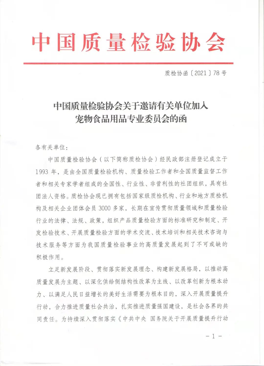 1. 中国质量检验协会宠物食品用品专业委员会发起单位回执表