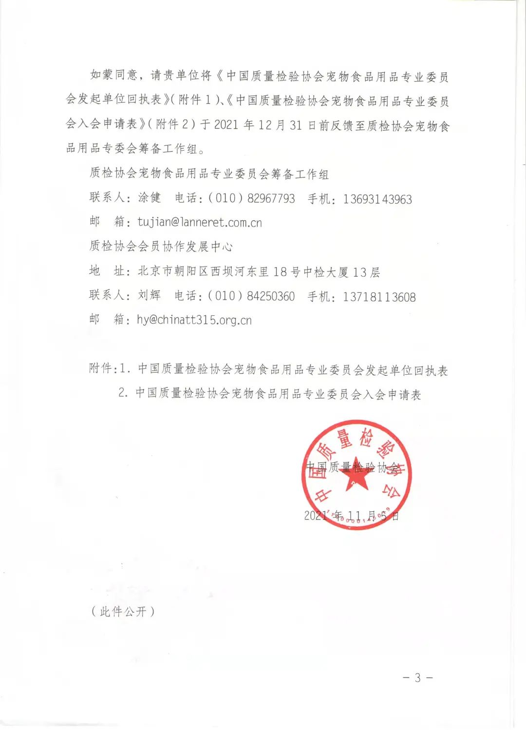 如蒙同意,请贵单位将《中国质量检验协会宠物食品用品专业委员会发起单位回执表》(附件1)、《中国质量检验协会宠物食品用品专业委员会入会申请表》(附件2)于2021年12月31日前反馈至质检协会宠物食品用品专委会筹备工作组。