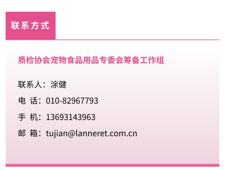 注:本次成立大会不收取任何费用,现场参会人员交通、食宿费用请自理。另,如想申请加入中国质量检验协会宠物食品用品专业委员会的请联系筹备工作组。