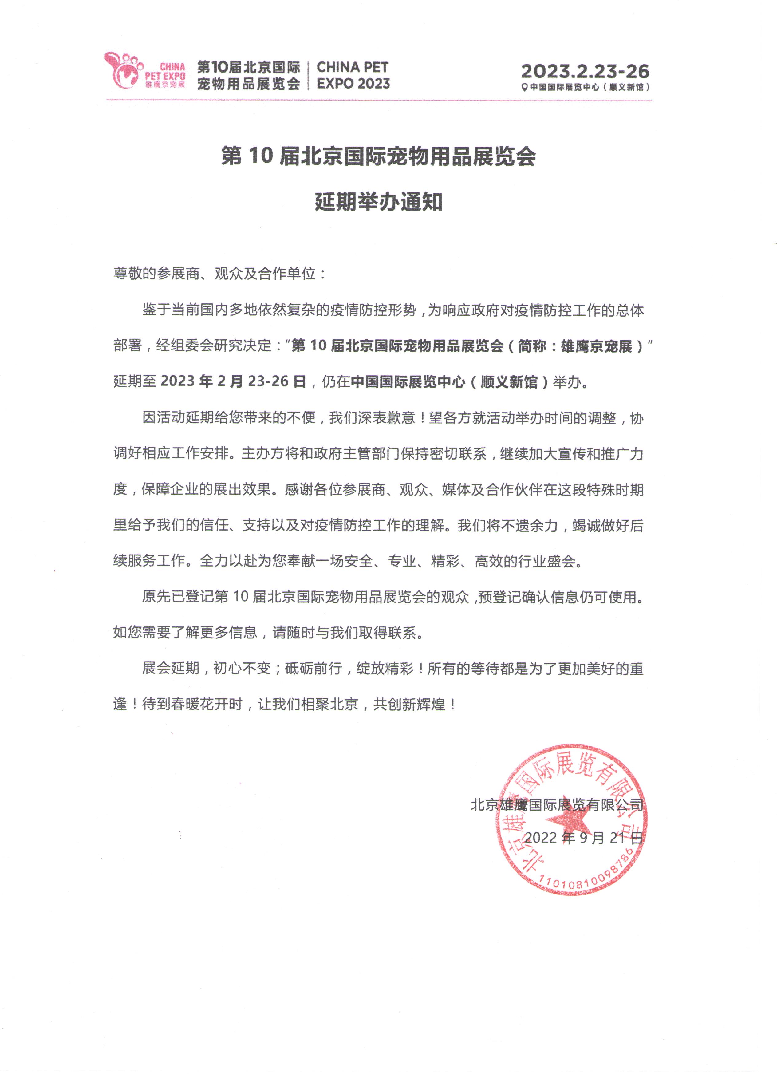 鉴于当前国内疫情多地爆发,疫情防控形式严峻复杂,为积极响应政府对疫情防控工作的总体部署,经组委会研究决定:“第10届北京国际宠物用品展览会(简称:雄鹰京宠展)”延期至2023年2月23-26日,仍在中国国际展览中心(顺义新馆)举办。