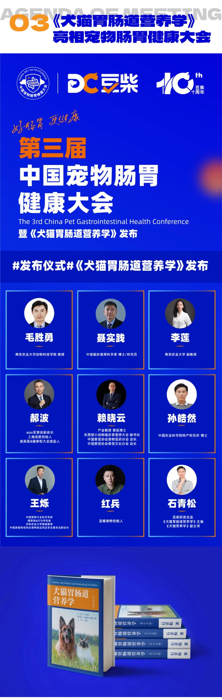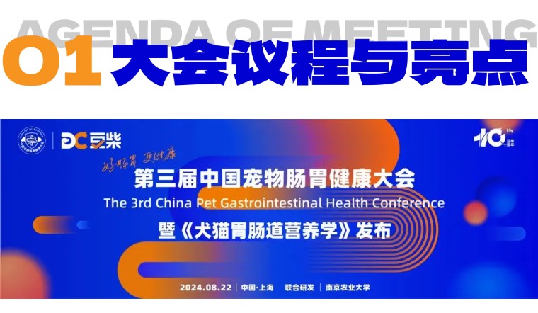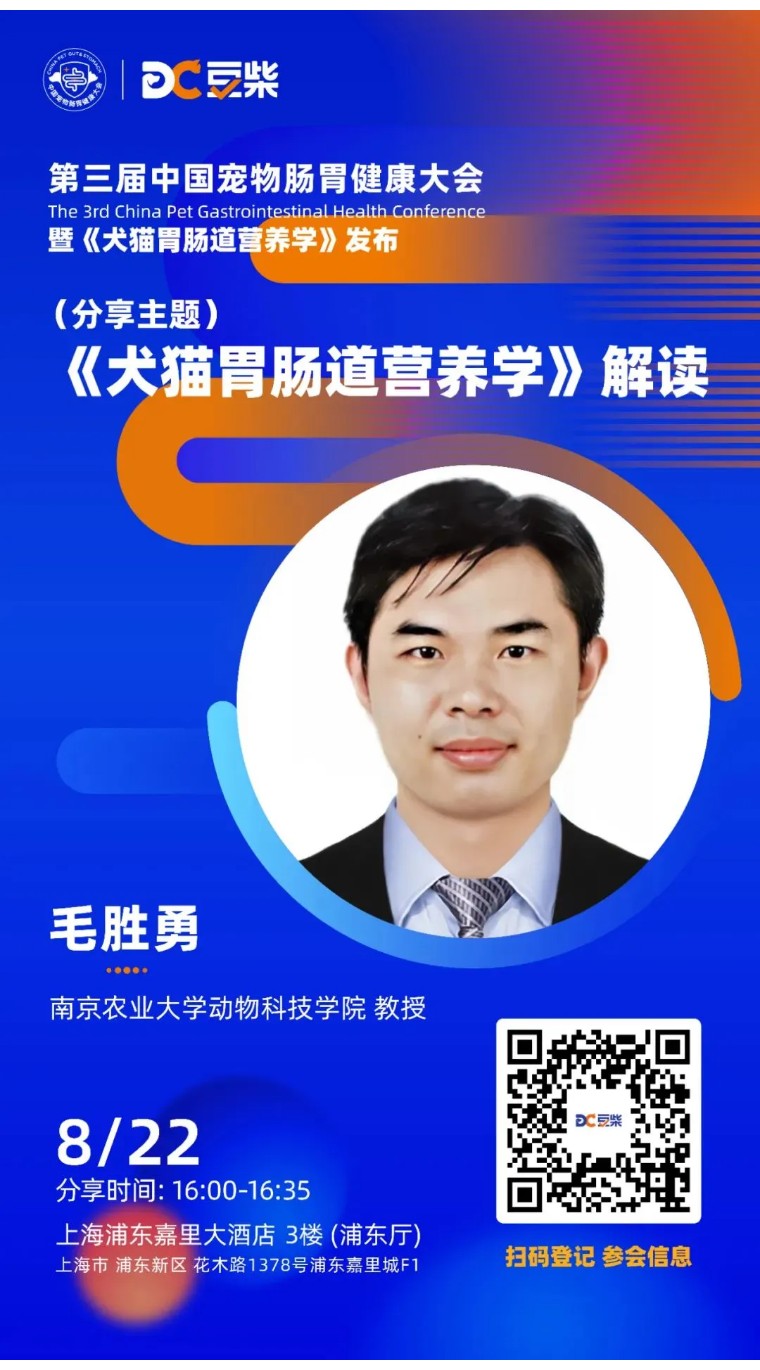 本届肠胃健康大会,将由南京农业大学动物科技学院毛胜勇教授、中宠股份首席科学家博士&研究员聂实践先生、南京农业大学副教授李莲女士、上海宠爱创始人郝波先生、产业教授兽医赖晓云博士、中国农业科学院特产研究所孙皓然博士、中国宠物行业知名专家王烁先生、豆柴宠物创始人红兵先生、豆柴研发总监石青松先生,将共同完成《犬猫胃肠道营养学》的发布仪式。