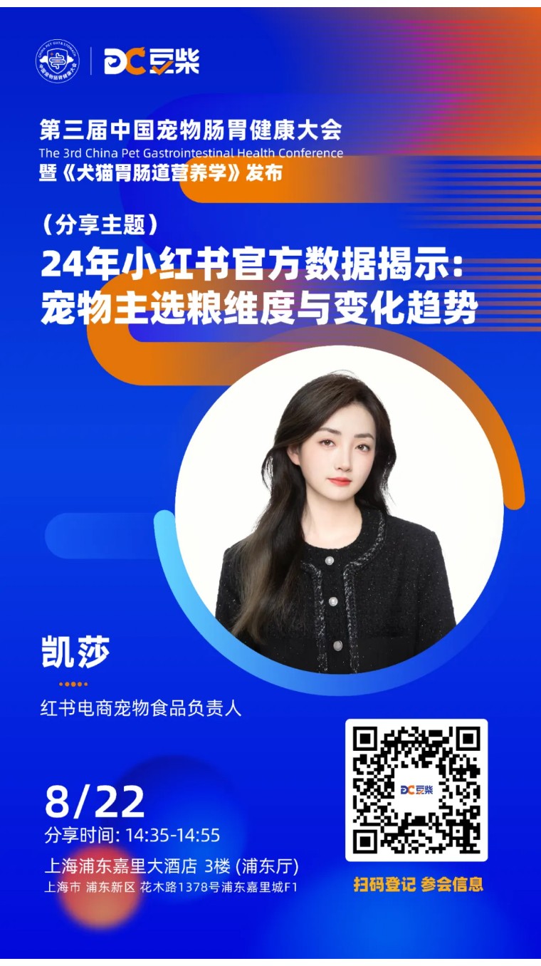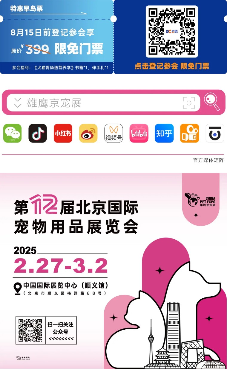 本届中国宠物肠胃健康大会8月22日参会票价为399元,限时早鸟票特惠——8月15日前扫下方二维码登记参会,即可免费参加,届时,现场签到可免费领取伴手礼一份以及豆柴《宠物胃肠道营养学》书籍一本,期待与大家相聚。