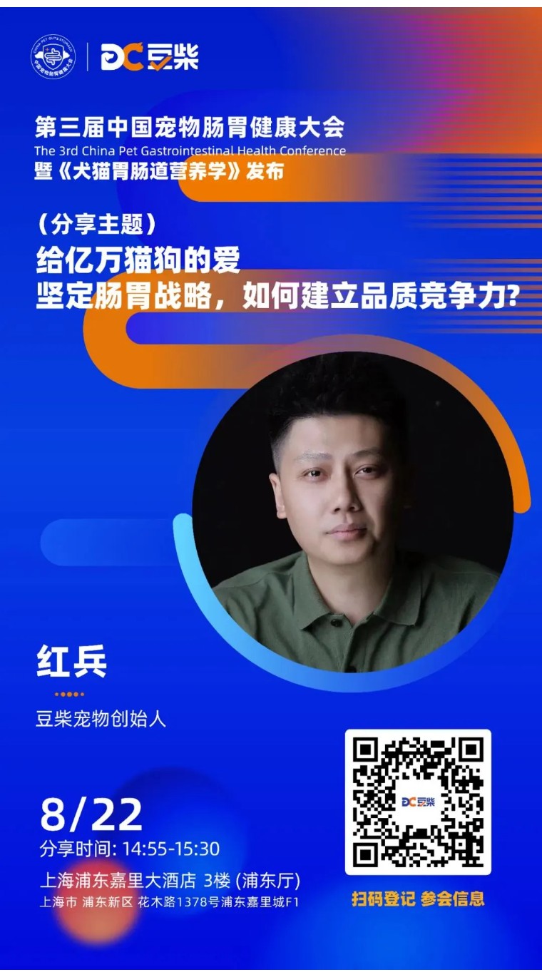 豆柴宠物创始人红兵,将再次强调肠胃健康的重要性——肠胃健康正成为中国高端养宠时代的最高声!只有深入了解中国宠物特征,坚定肠胃战略,才能更好地守护宠物肠胃健康。—— 给亿万猫狗的爱 坚定肠胃战略,如何建立品质竞争力?
