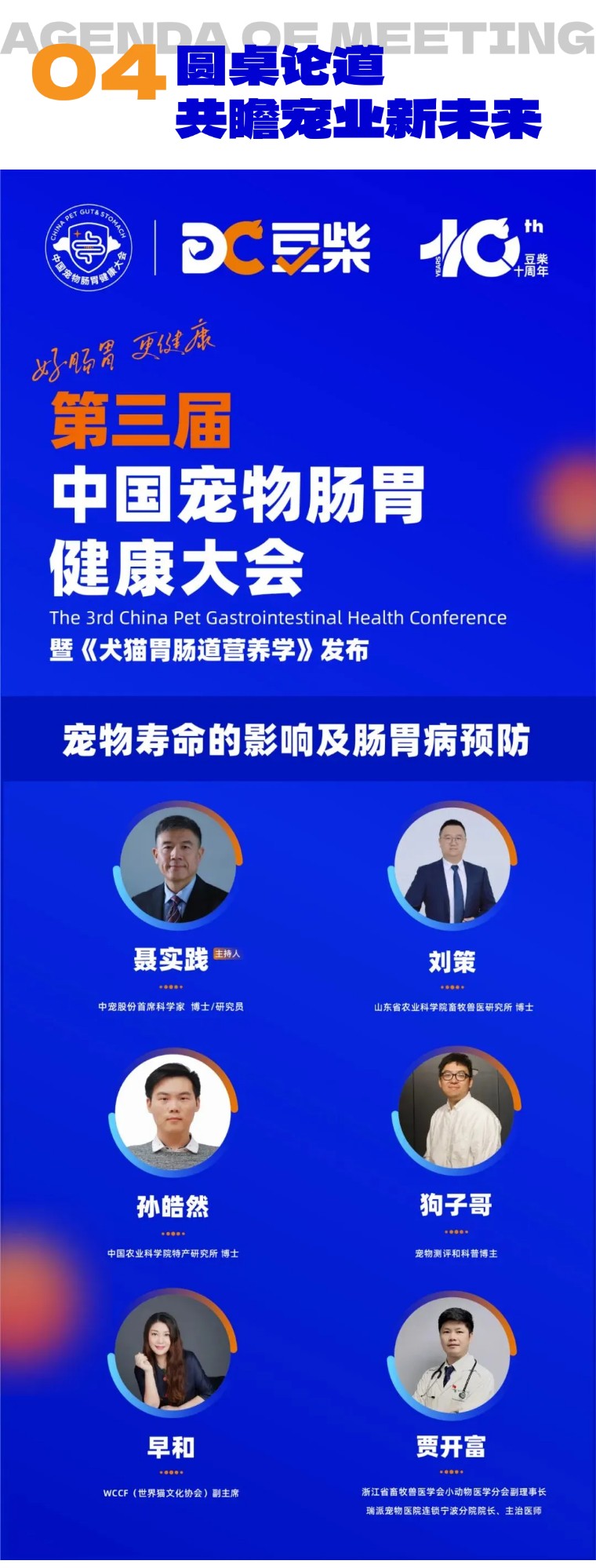 本次大会还将带来2场精彩的圆桌对话:围绕“宠物寿命的影响及胃病预防”的议题,我们集结了业内顶尖的科学家、专家和学者等重量级嘉宾,从喂食习惯、营养搭配、日常护理、疾病预防等方面,深度探讨宠物寿命与胃肠道健康之间的密切关联。我们将在现场汲取8位宠界精英的高阶智慧,与业内同仁展开深度的思想碰撞,为宠物生命的健康长久提供更多思路。