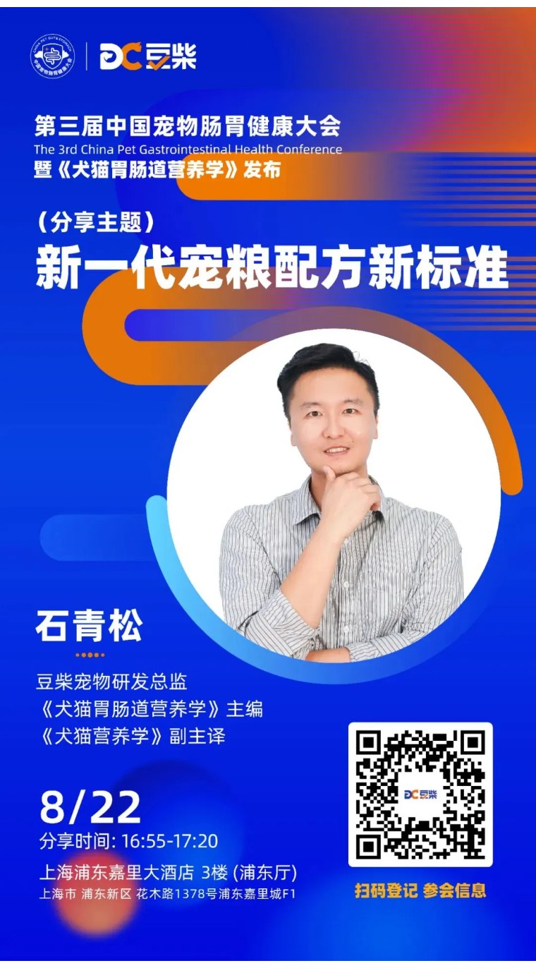 《犬猫胃肠道营养学》主编、豆柴宠物研发总监石青松先生,将分享豆柴百宠肠胃健康挑战赛精彩事例,并提出宠物肠道健康的新标准,剖析打造宠物肠胃力的关键因素,提升宠物的整体健康水平。— 新一代宠粮配方新标准。