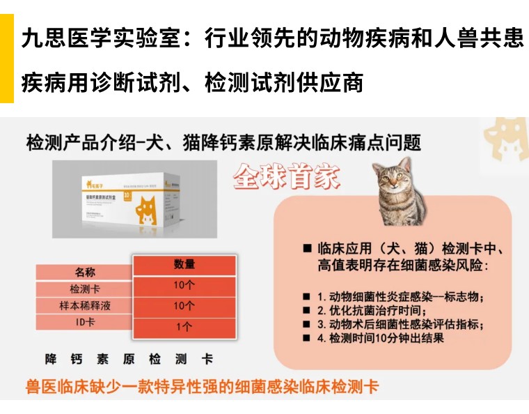 创新型产品:主要产品包括犬、猫细菌感染降钙素原检测卡,解决了兽医临床缺少特异性强的细菌感染检测卡的问题。