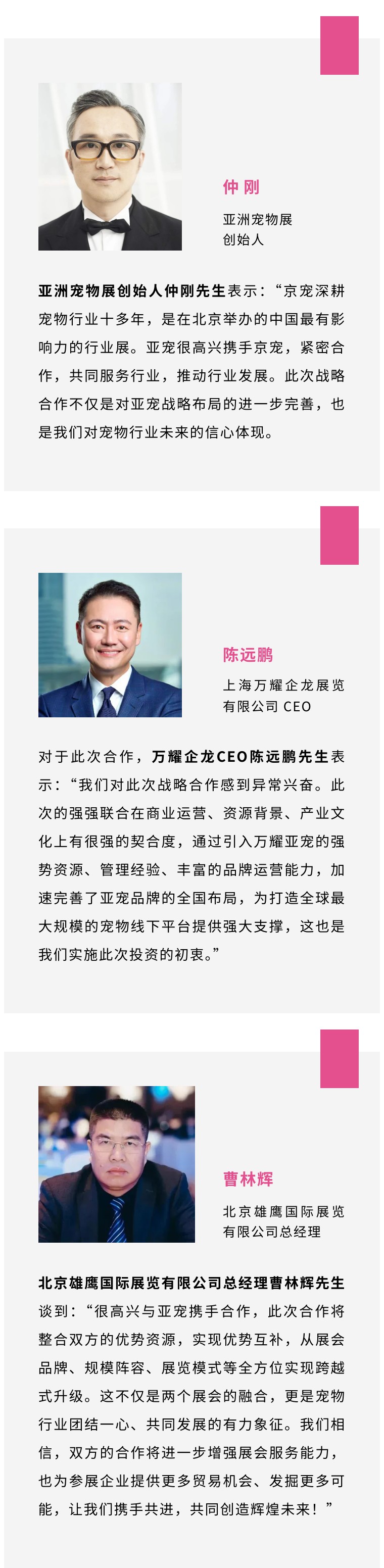 在2024亚宠即将盛大开幕之际,又迎来重磅利好消息,亚洲宠物展主办方,上海万耀亚宠展览有限公司(以下简称“万耀亚宠”)正式宣布与北京雄鹰国际展览有限公司达成战略合作,对其旗下北京国际宠物用品展览会(雄鹰京宠展)进行战略投资,并将于下周亚宠展期间签署战略合作协议。此次的强强联合将在宠物行业创造更大的影响力和市场协同效应,为行业打造更高效的综合性商贸服务平台。