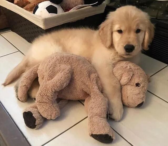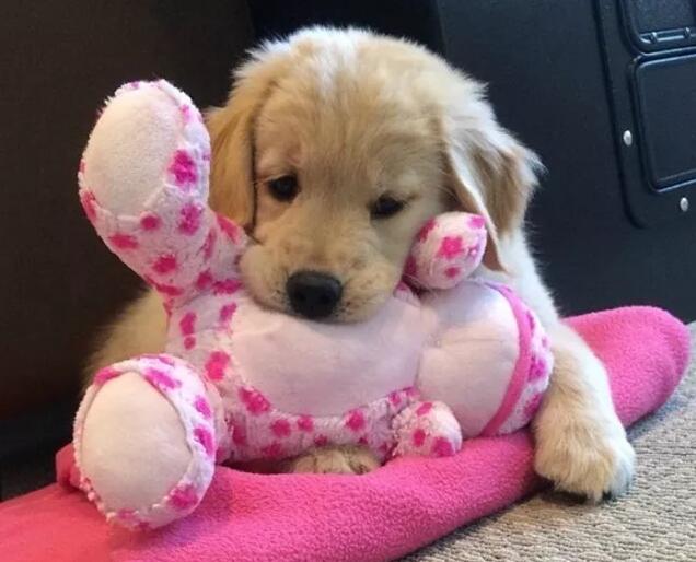 这只金毛小奶狗,拥有粉色少女心,抱着娃娃貌似在想什么?