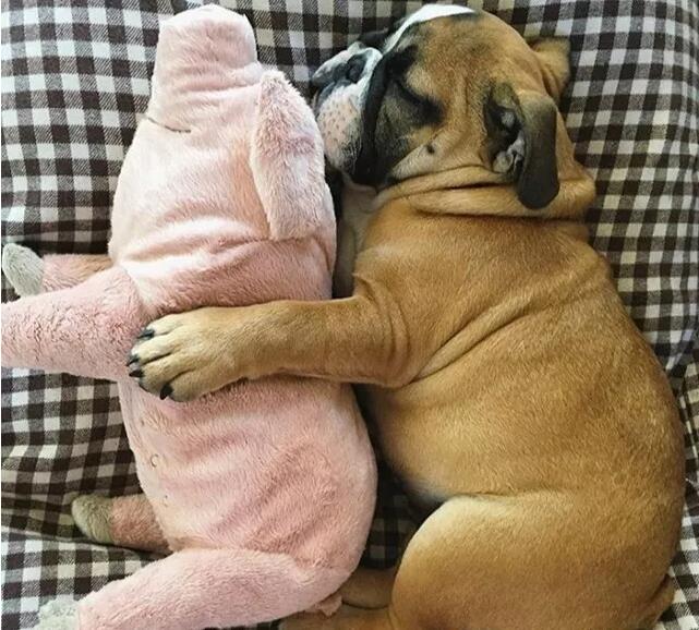 这条犬搂着粉色小猪睡觉,恐怕被别人抢走?