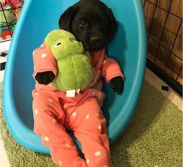 这条乌黑亮丽穿着睡衣,抱着小玩偶,这生活也太滋润了吧!