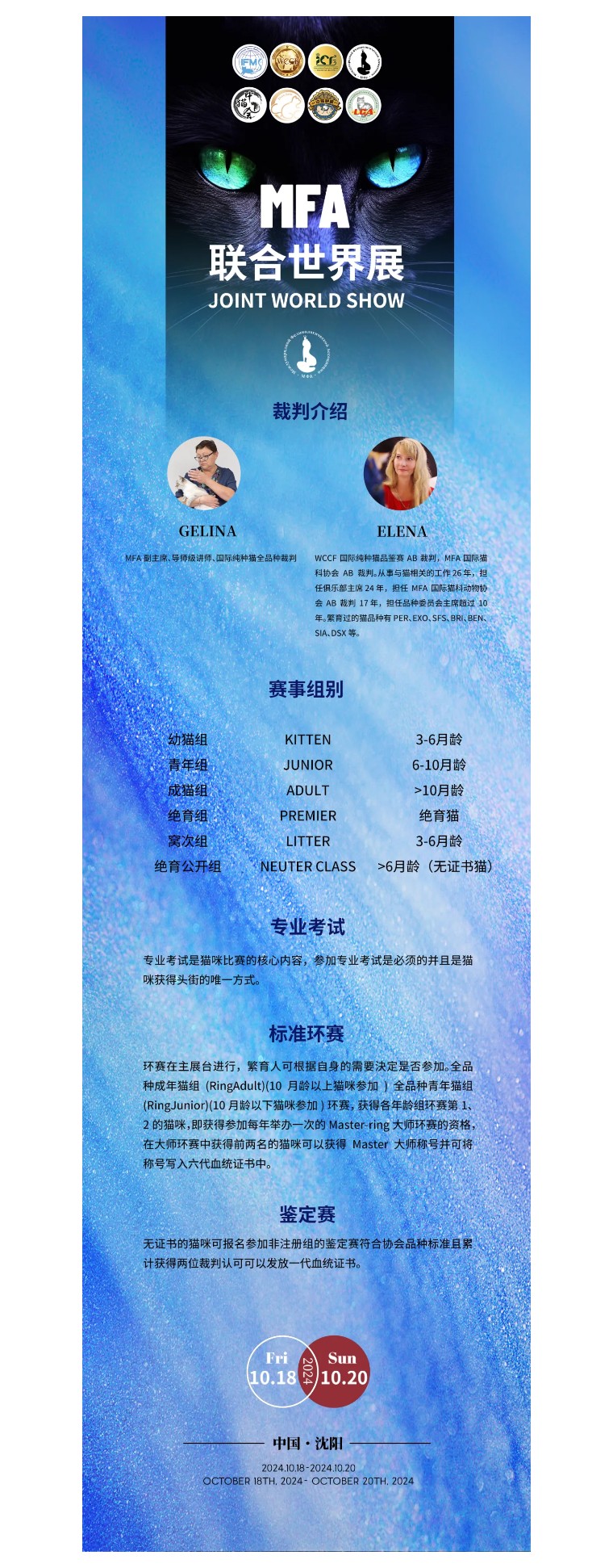 WCCF携手MFA、ICF、中猫会,以及SGCC、中猫联盟、LCA、IFMS等众多赛事平台,一场跨越时间与地点的猫咪盛宴应运而生。这不仅是对纯种猫繁育艺术的最高致敬,更是翘首以盼的年度大戏。在这里,每一道身影都承载着繁育者的心血与梦想,每一次凝视都交织着对美的无尽追求。