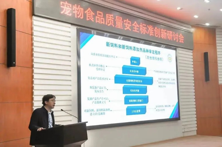 全国畜牧总站饲料评审处处长杜伟先生发表了《新饲料和新饲料添加剂申报程序及材料要求》专题报告,从法规依据、申报程序、材料和评审要求三个方面展开分享,阐述了宠物饲料及饲料添加剂申报的规范性要求和管理办法。
