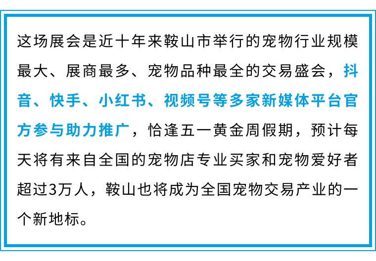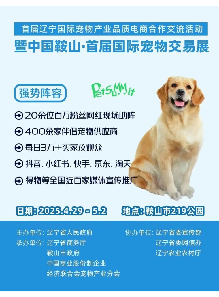 由辽宁省人民政府主办,辽宁省委宣传部、省委网信办、省农业农村厅协办,辽宁省商务厅、鞍山市人民政府、中国商业股份制企业经济联合会宠物产业分会承办的“中国鞍山·首届国际宠物交易展”,将于4月29日在鞍山市219公园盛大开幕。