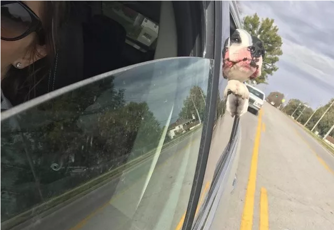 布莱恩把米奇带到车上,开车带着米奇出去巡视时,它在车上喜欢把鼻子放在车窗外。