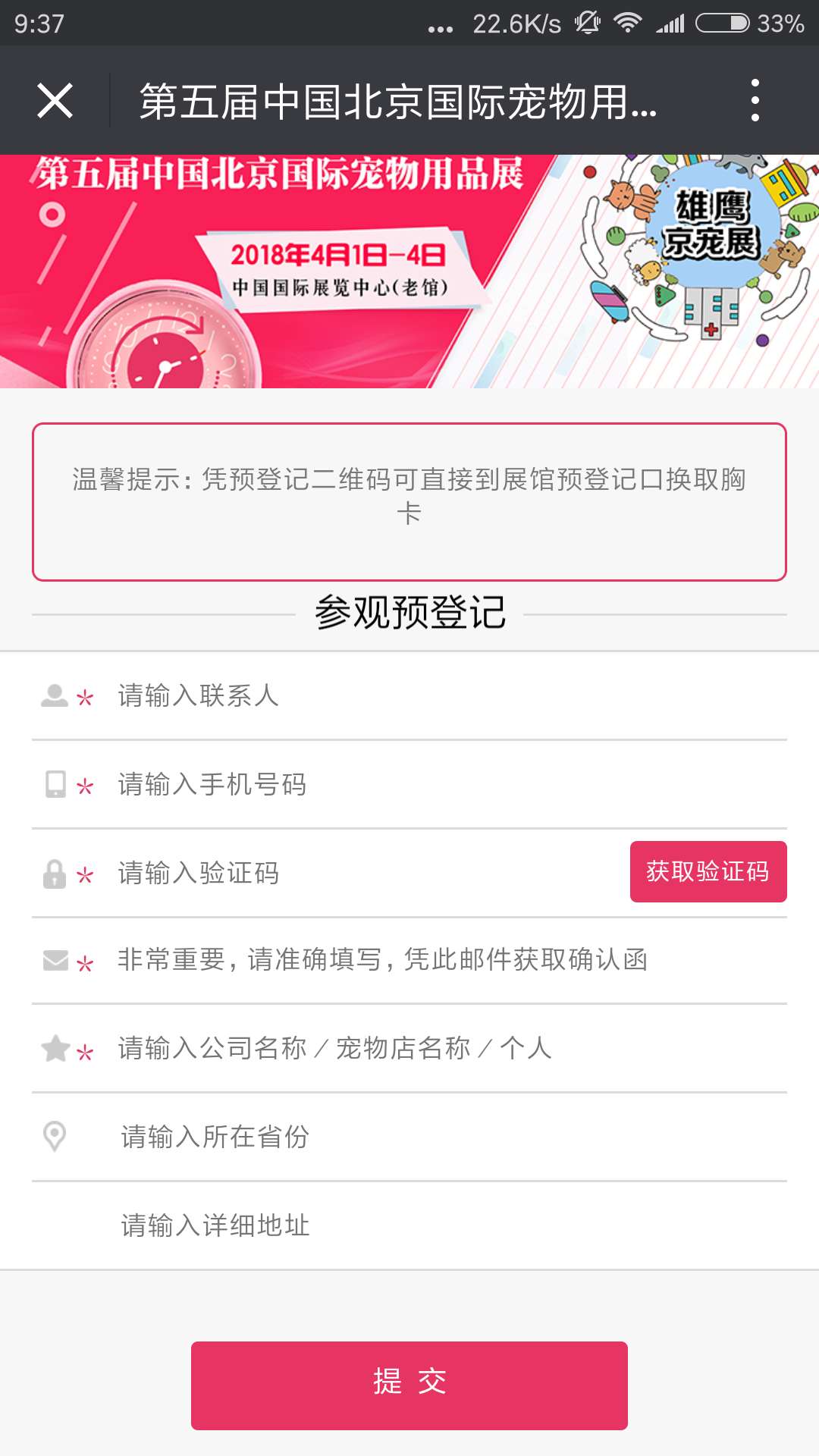 2018京宠展免费预登记系统全面上线!家中在线预登记,现场只需输入注册手机号,参观证轻松拿到手!高端展示区,为专业观众寻找新品提供捷径,有专业的对接服务,为专业观众与企业提供优质的服务平台。