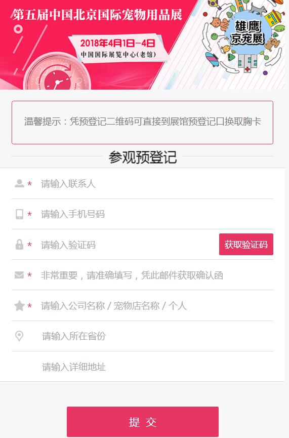 在官方网站“首页最下端”→“扫一扫预登记”二维码,在跳转页面中填写个人信息,完成网上登记报名,凭二维码到展会现场免费换取“参观证”,凭证入场参观,参观2018京宠展不需要费用。