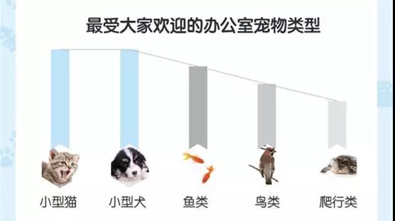 而在诸多被带入办公室的宠物中,最受大家欢迎的分别为小型猫和小型犬,鱼类、鸟类、爬行类动物紧随其后。相较于传统企业和大公司的规章严明,新生代互联网公司轻松、活泼的办公环境和开放、自由的工作理念更适合上班族带着宠物上班。因此,宠物类、生活类、媒体类、旅游类等小规模创业公司对宠物的包容性和接纳度更高。