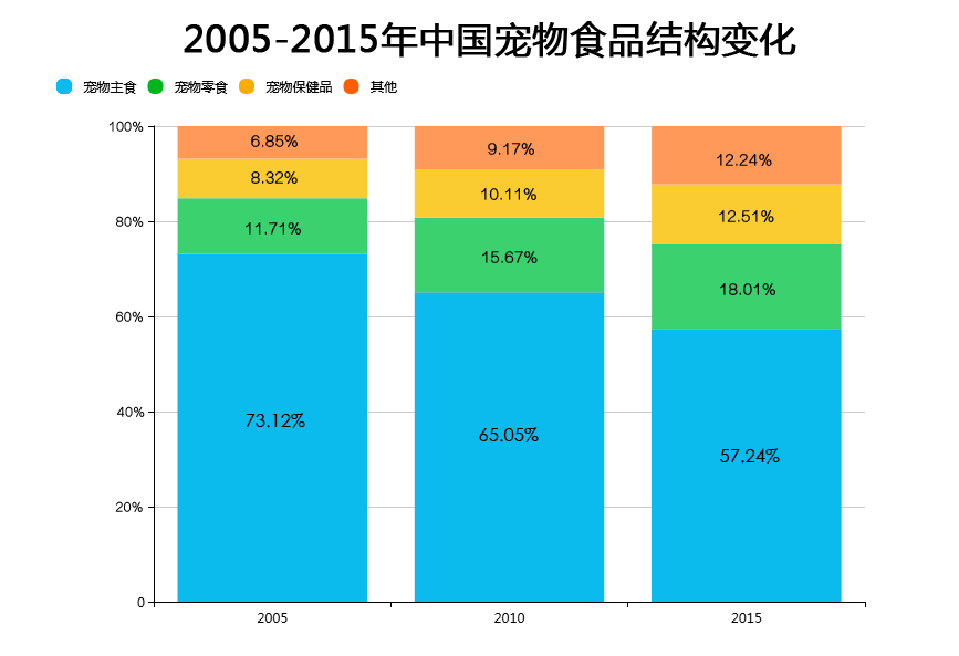 在宠物食品产业中,宠物主食(干粮&湿粮)占据50%以上份额,是绝对主力。但经过十余年的发展,随着零食、保健品产品的丰富,消费观念的改变以及消费市场的升级,宠物主粮出现了一个逐步下降的趋势,零食的市场份额由10%左右上升至接近20%,而保健品市场份额占比也上升了6%左右。