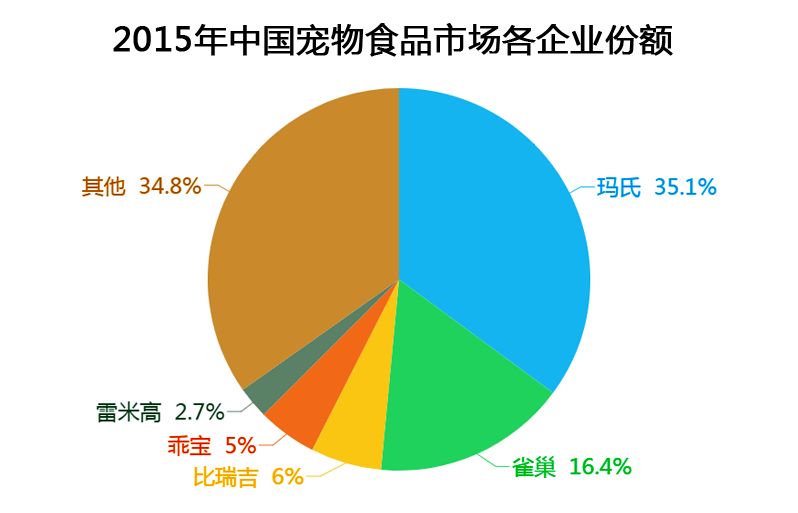 而从品牌分布来说,由于国际品牌进入中国市场较早,在销售渠道布局以及品牌营销方面占尽优势,所以,我国目前的宠物主粮市场被玛氏、雀巢以及高露洁等几大巨头所占据。2016年,这三家外资品牌在我国市场的占有率超过50%,且主要定位中高端市场。而国产宠物食品大多定位于低端市场,且单品牌市场占有率不足10%。