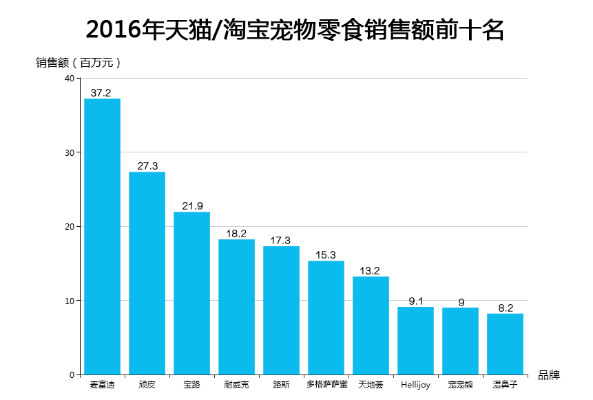 如果说主粮市场被国际品牌占据是“雨”的话,零食市场则是另一番“晴”的景象。根据淘宝/天猫销售数据显示,2016年犬类零食销售额前十的品牌中,有8个为国产品牌。