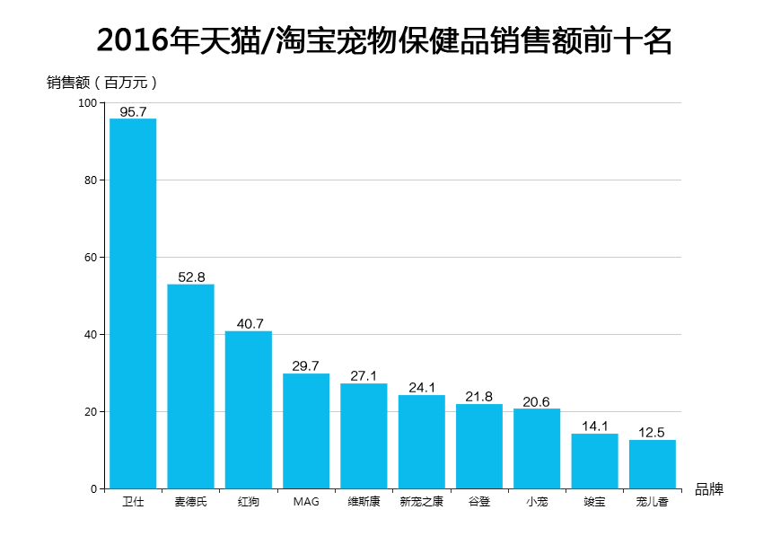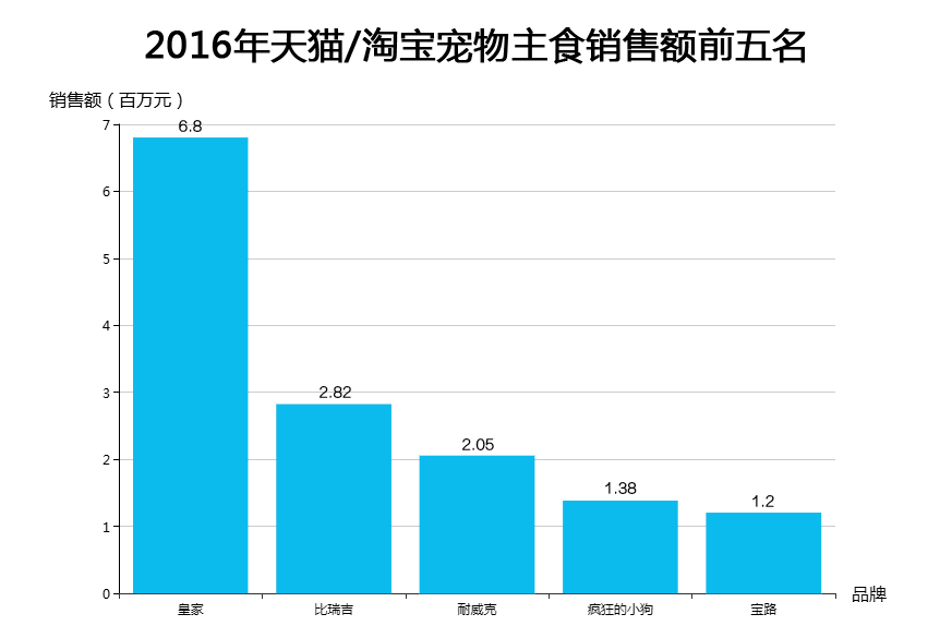 淘宝/天猫的销售数据也印证了这一点。皇家(玛氏)2016年在淘宝/天猫的主粮品类销售额达到6.8亿元,大幅领先第二名比瑞吉和第三名耐威克。国产品牌疯狂的小狗排名第四。