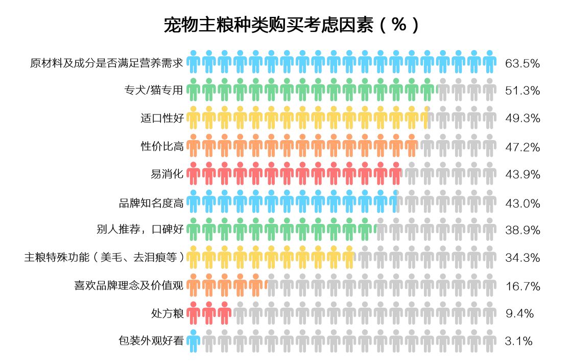 然而,值得注意的是,虽然主粮市场国际品牌占据“擂主”位置,但国内品牌并非不可“攻擂”。据《2017年中国宠物行业白皮书》显示,消费者对于主粮市场的品牌忠诚度并不高,更多的是关注“营养成分“、”适口性“及”性价比”。这对于国内宠物主粮品牌来说是一件好事。国产主粮品牌如果可以专注于提升产品品质、顺应消费升级趋势是有很大可能提升市场份额的。