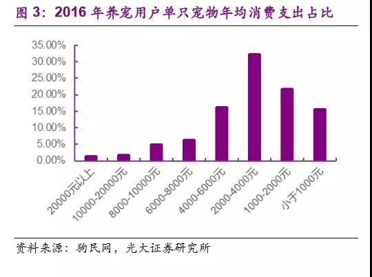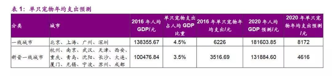 单只宠物年均消费支出。考虑到我国各地区经济发展不平衡,各线城市人均GDP水平相差较大,因此对于宠物市场规模预测,我们采取对不同城市类别采取区分预测的方式。根据《第一财经周刊》的中国城市分级最新划分,我们将中国的400个城市划分为:一线城市、新晋一线城市、二线及省会城市,其他城市四种类型。根据狗民网的调研,2016中国的养宠用户单只宠物年均消费支出主要集中在2000-4000元,占比32.2%。我们认为单只宠物年均消费支出与各地区的人均GDP有相关关系,根据四种类型城市的人均GDP水平差异,我们假设这四种类型城市的2016年单只宠物年均消费支出占人均GDP的比重分别为4.5%、3.5%、2.5%、1.5%,即2016年单只宠物年均消费支出分别为:6226元、3517元、1811元、594元。